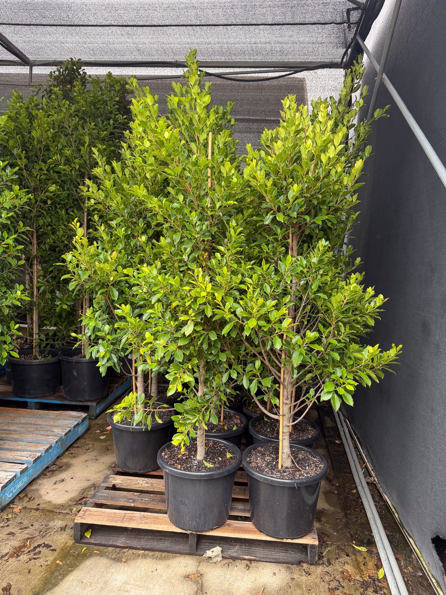 Ficus hillii ‘Flash’ is a fast-growing evergreen commonly used for dense hedging, privacy screening, and pleaching. With lime-green new growth that contrasts against its glossy, dark green foliage, it delivers a clean, structured look suited to residential and commercial landscapes.